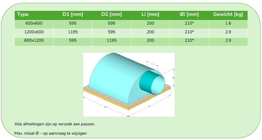 De inlaat kan worden aangesloten op zowel vaste als flexibele toevoerkanalen en is leverbaar met een verstelbare band (geschikt voor kanaaldiameters van Ø110 tot Ø255 mm) of met exact op maat gemaakte aansluitingen voor specifieke inlaatvormen.