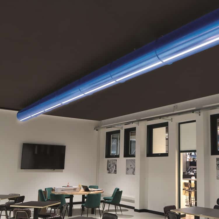 De transparantie van het gebruikte technopolymeer maakt het mogelijk om de verlichting direct in het luchtkanaal zelf te integreren. Dit gepatenteerde systeem biedt ontwerpers en architecten nieuwe mogelijkheden om innovatieve installatieconcepten te ontwikkelen en toe te passen, waarbij esthetiek en techniek naadloos samenkomen.
